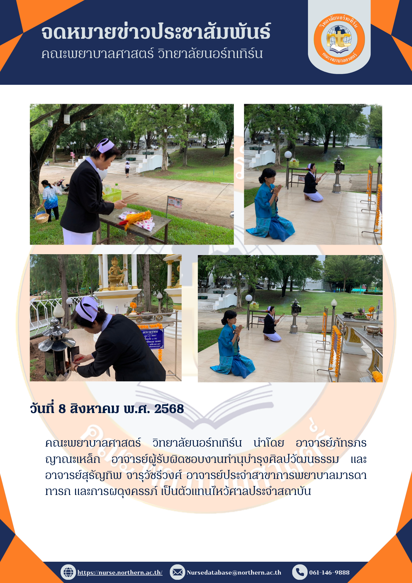 คณะพยาบาลศาสตร์ วิทยาลัยนอร์ทเทิร์น นำโดย อาจารย์ภัทรภร ญาณะเหล็ก อาจารย์ผู้รับผิดชอบงานทำนุบำรุงศิลปวัฒนธรรม และ อาจารย์สุธัญทิพ จารุวัชรีวงศ์ อาจารย์ประจำสาขาการพยาบาลมารดา ทารก และการผดุงครรภ์ เป็นตัวแทนไหว้ศาลประจำสถาบัน / ข่าวสาร / By eis