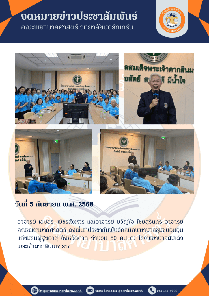 คณะพยาบาลศาสตร์ วิทยาลัยนอร์ทเทิร์น นำโดย อาจารย์เจนนารา วงศ์ ปาลี คณบดีคณะพยาบาลศาสตร์ อาจารย์ภัณฑิรชา เฟื่องทอง อาจารย์ผู้รับผิดชอบหลักสูตรสาขาการพยาบาลผู้ใหญ่และผู้สูงอายุ อาจารย์ศิริพร วงศ์จันทรมณี อาจารย์ประจำหลักสูตรสาขาการพยาบาลผู้ใหญ่และผู้สูงอายุ และ อาจารย์ภัทรภร ญาณะเหล็ก อาจารย์ประจำสาขาการพยาบาลผู้ใหญ่และผู้สูงอายุ ประชุมชี้แจงการจัดการเรียนการสอน รายวิชา NS2212 ปฏิบัติการพยาบาลผู้สูงอายุ ร่วมกับแหล่งฝึก นำโดย นางนิตยา สุวรรณาภรณ์ รองผู้อำนวยการฝ่ายพยาบาล ในวันที่ 19 สิงหาคม พ.ศ.2568 เวลา 14.00 – 16.00น. ณ ห้องประชุมหลวงพิชัยอาสา โรงพยาบาลสมเด็จพระเจ้าตากสินมหาราช